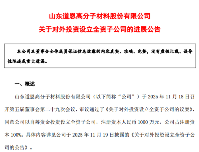 与资产剥离同步推进的,是道恩股份在新业务领域的积极扩张。同日公告显示,公司全资子公司山东道恩科技有限公司(下称“道恩科技”)已于11月25日完成工商注册,注册资本1000万元,经营范围涵盖技术服务、技术开发、高性能纤维及复合材料销售、生物基材料销售等核心领域。